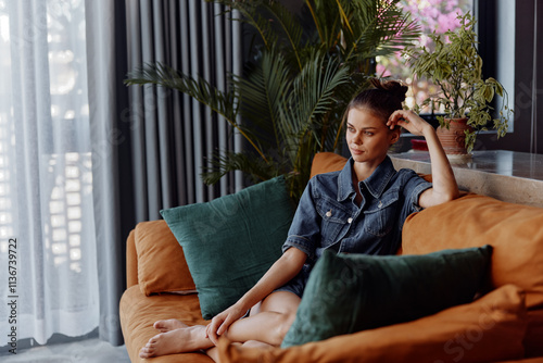 Woman sitting on orange couch by window with plant in background in cozy living room setting
