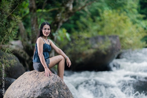 Woman Sitting on Rock by Stream in Lush Forest with Waterfalls