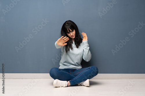 Woman sitting on the floor nervous and scared stretching hands to the front