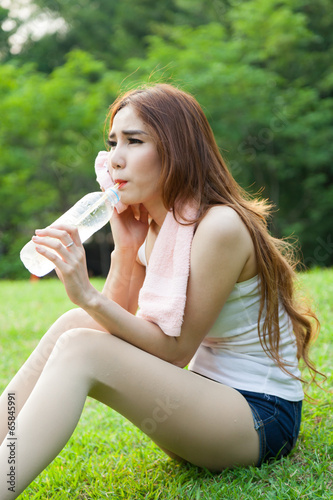 Woman sitting tired and drinking water after exercise.
