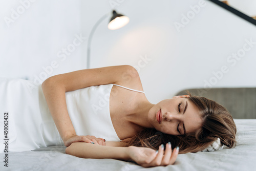 Woman sleeping. Beautiful young woman with long hair lying in the bed and keeping eyes closed while sleeping at the morning. People lifestyle and female appearance concept