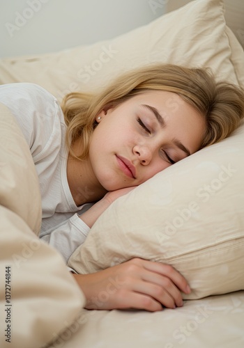 Woman sleeping in luxurious bed linens with an airy atmosphere