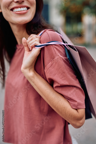Woman smiling brightly and carrying shopping bags on her shoulder, enjoying successful shopping trip and lifestyle