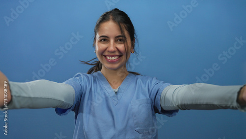 Woman smiling in hospital scrubs against isolated blue background showing arms outward in a welcoming gesture representing healthcare positivity and confidence.