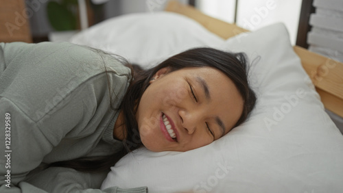 Woman smiling peacefully in bed at home, depicting a serene indoor setting, emphasizing comfort and relaxation in a bedroom environment with soft natural lighting.