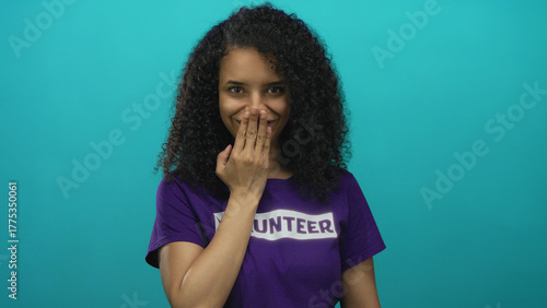 Woman smiling with hand over mouth wearing purple volunteer shirt against isolated blue background conveying friendly community spirit.