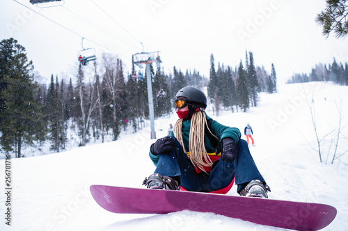 Woman snowboarder with dreadlocks it sitting with a snowboard on the ski slopes.