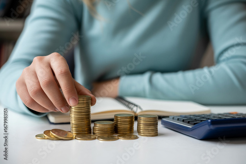 Woman stacking coins saving money financial planning investment growth and budgeting personal finance concept