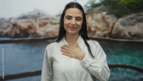 Woman standing by the seaside with a hand on her heart, exuding confidence against a backdrop of rocky cliffs and a calm ocean, embracing the outdoor atmosphere.