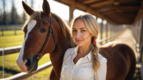 Woman standing next to horse at the horse stud in countryside. Equestarian and horseback riding hobby. Woman horse rider