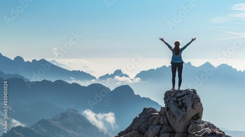 Woman standing on a mountain peak with arms raised, enjoying a panoramic view of misty mountains under a clear blue sky.