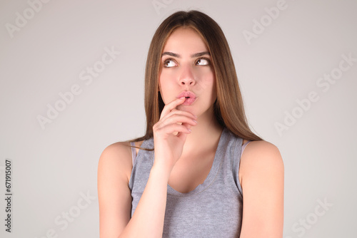 Woman standing over gray background thinking about question. Pensive expression. Thoughtful face. Doubt concept. Thinking question, thoughtful about confusing idea.