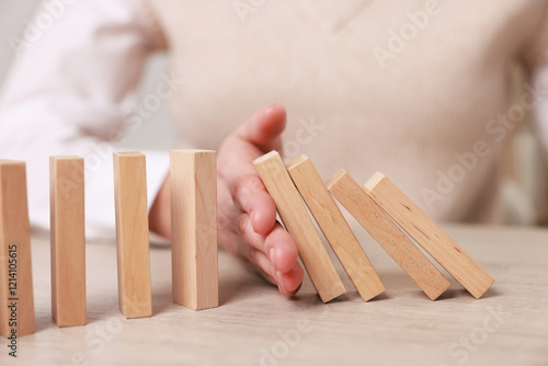 Woman stopping wooden blocks from falling at table, closeup. Domino effect