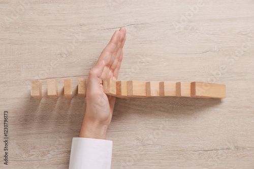 Woman stopping wooden blocks from falling at table, closeup. Domino effect