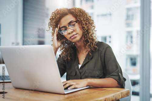 Woman, stress and headache on laptop in office for glitch, eye strain pressure and project mistake of burnout. Female person, migraine and pain for brain fog with anxiety, report crisis and fatigue