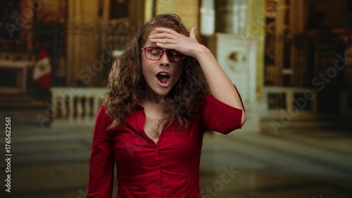 Woman surprised inside church with curly hair wearing glasses and red shirt with flag in background displaying shocked emotion indoors