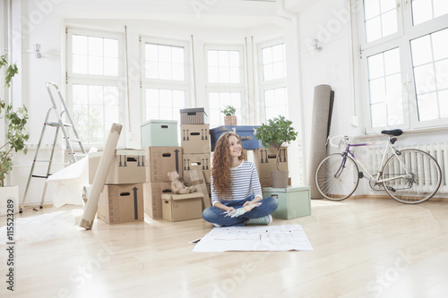 Woman surrounded by cardboard boxes sitting on floor with construction plan