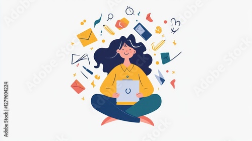 Woman Surrounded by Colorful Office Supplies and Documents, Illustration
