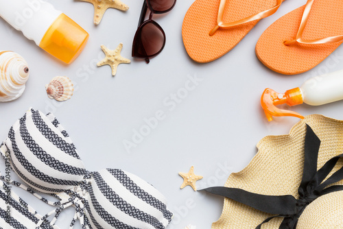 Woman swimwear and beach accessories flat lay top view on colored background Summer travel concept. bikini swimsuit, straw hat and seasheels. Copy space Top view