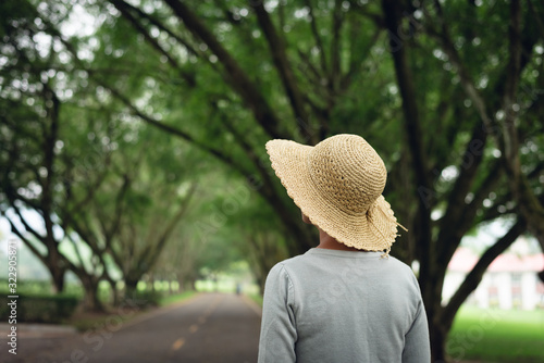 woman take a walk on the way under the trees