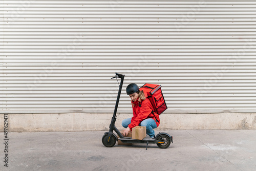 Woman taking carton boxes while working on scooter