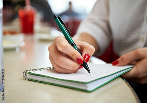 Woman taking notes in a spiral notebook at a restaurant table, holding a pen and writing while enjoying a meal and drink