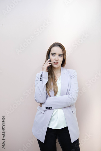 Woman talking on the phone while standing against a light pink wall in a modern setting