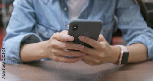 Woman touch on cellphone in restaurant
