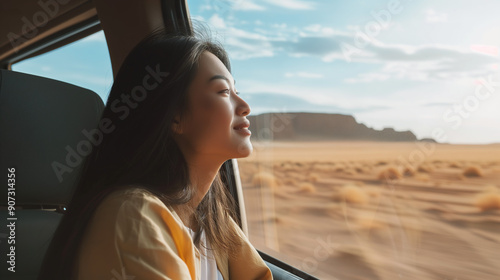 Woman tourist on road, enjoying window view and traveling on holiday road trip. Place for text.
