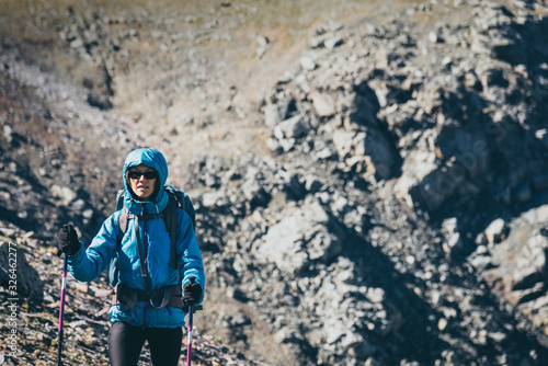 Woman tourist with a backpack engaged in trekking in the mountains, makes the ascent. Free space for text