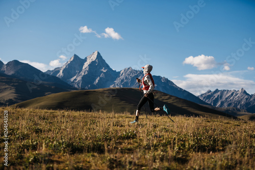 Woman trail runner running on grassland with rocky mountains in the distance