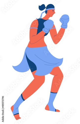 Woman training muay thai isolated on white. Handband, skirt and ankle guards female uniform
