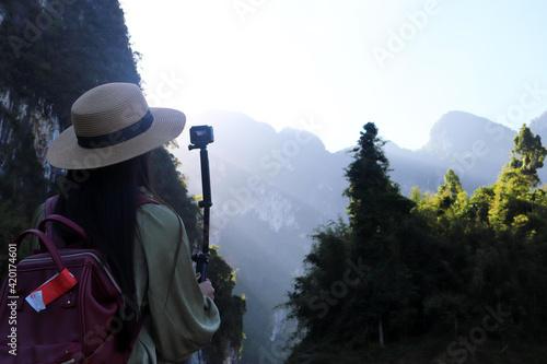 Woman traveler standing to take a photo with scenery view of the mountains and sunray in the morning natural background. Concept of light and shadow formed by nature