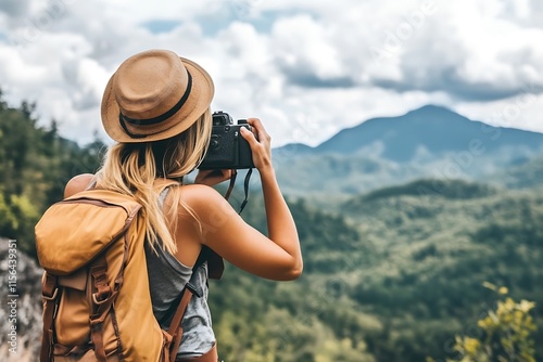 Woman Traveler Taking Photo of Mountain Landscape. Adventure, Photography, Travel