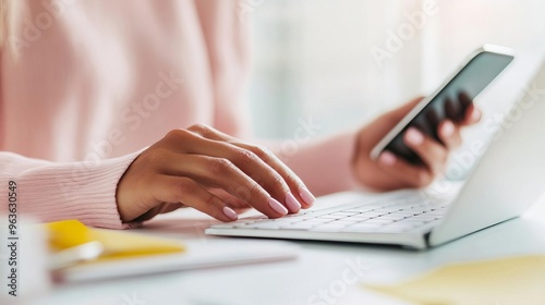 Woman typing on a keyboard while checking notes on a smartphone, multitasking, effective communication