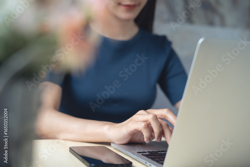 Woman typing on laptop computer, searching information, surfing the internet. Casual business woman remote working on laptop from home office, business casual, digital nomad
