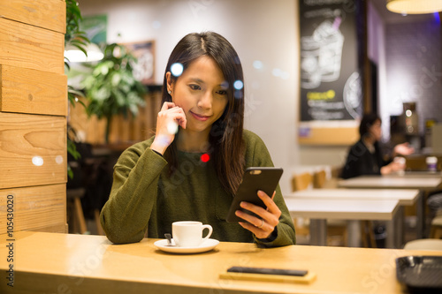 Woman use of smart phone in cafe at night