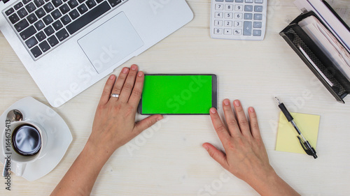 woman using a mobile phone smartphone with green screen at her desk in the office - top view