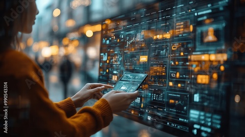 Woman Using Futuristic Technology Interface - Data Visualization and Interactive Digital Display