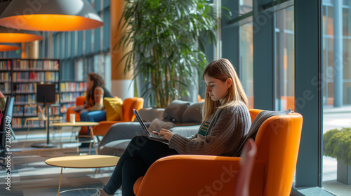Woman Using Laptop Computer in Library