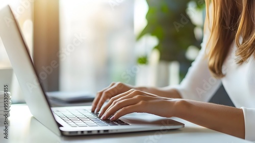 Woman Using Laptop in Bright and Airy Office Space