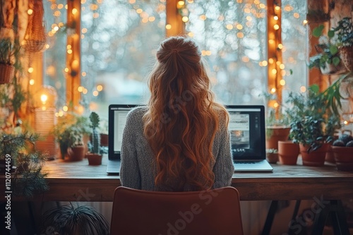 Woman using laptop in cozy home office with blank screen for online activities and work