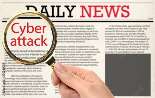 Woman using magnifying glass to read newspaper with headline CYBER ATTACK, closeup