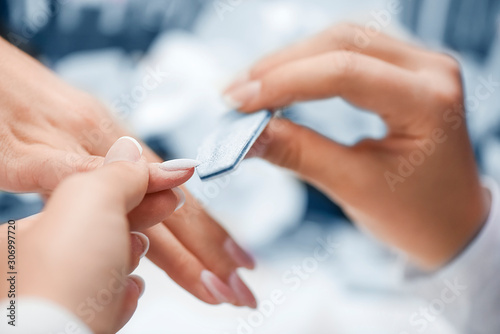 Woman using nail file in beauty salon detail. Luxury nails manicure or skin care.
