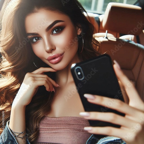 woman using phone, beautiful girl, brown-haired, takes a selfie