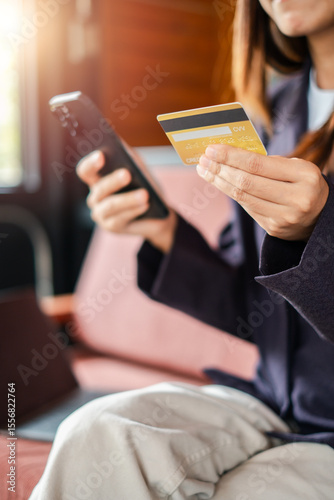 Woman using smartphone and credit card for online shopping, seated in a cozy room with sunlight streaming in.