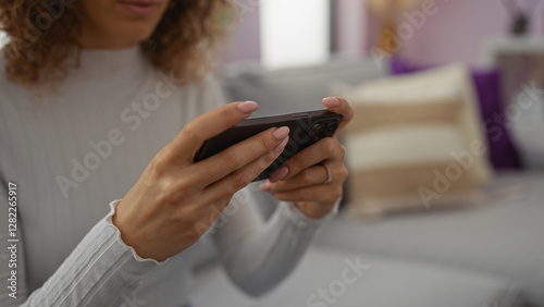 Woman using smartphone in cozy living room, displaying relaxed atmosphere, focus on hands, showcasing casual home environment, highlighting technology and everyday lifestyle.
