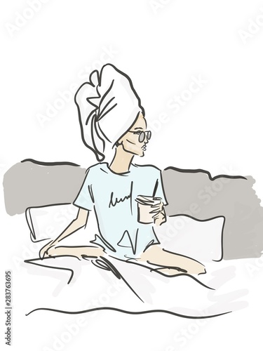 Woman using tablet at cozy home atmosphere on the bed. Young woman with cup of cocoa or coffee in hands enjoying free time with comfort. sketch illustration