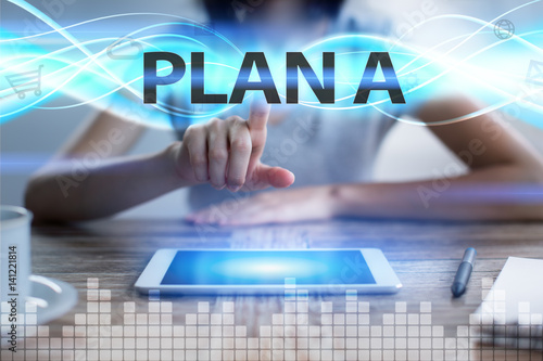 Woman using tablet pc, pressing on virtual screen and selecting plan a.