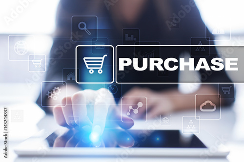 Woman using tablet pc, pressing on virtual screen and selecting purchase.